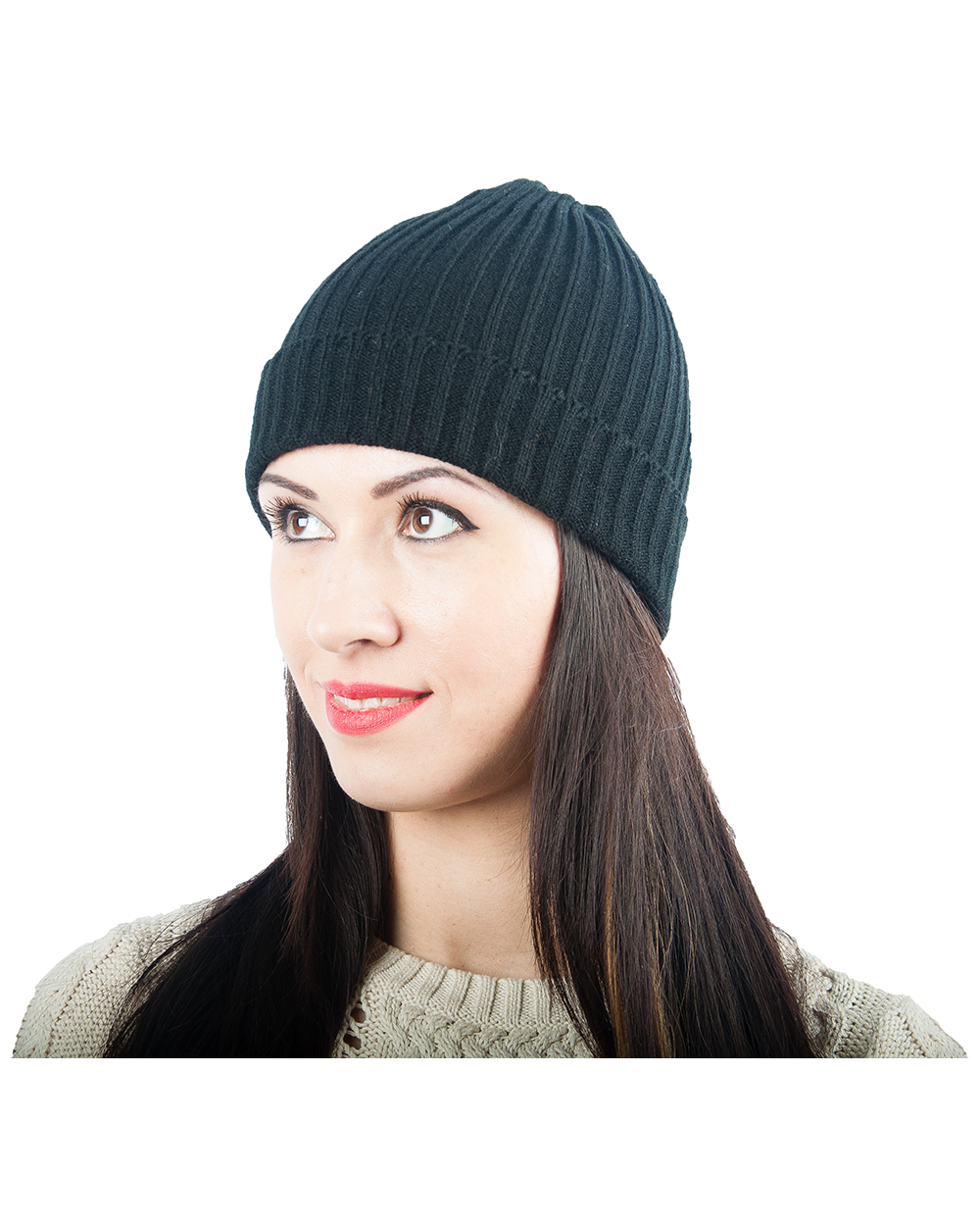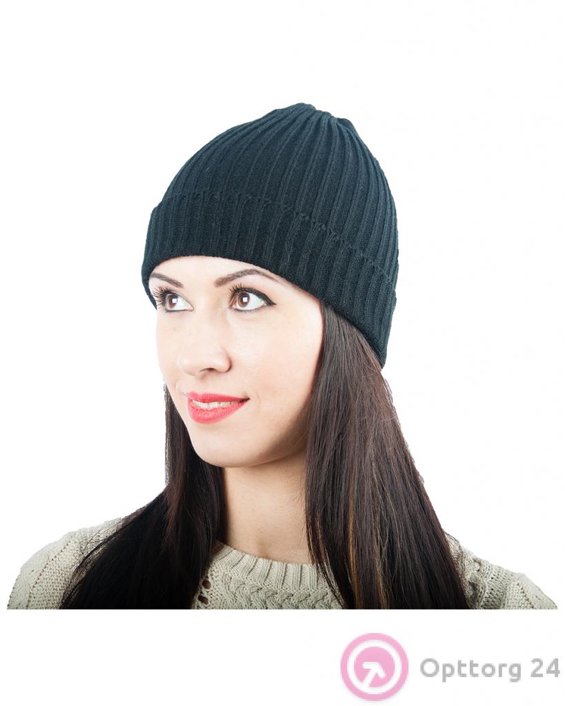 Шапка унисекс черная вязаная в мелкий рубчик с отворотом оптом