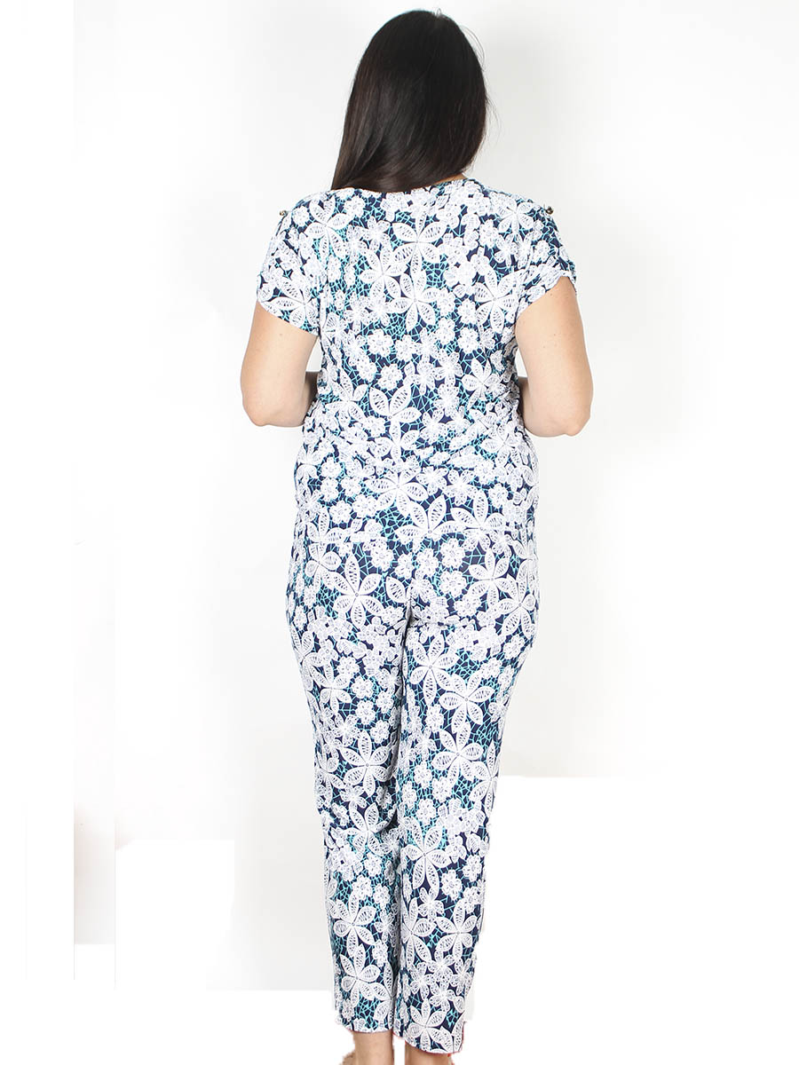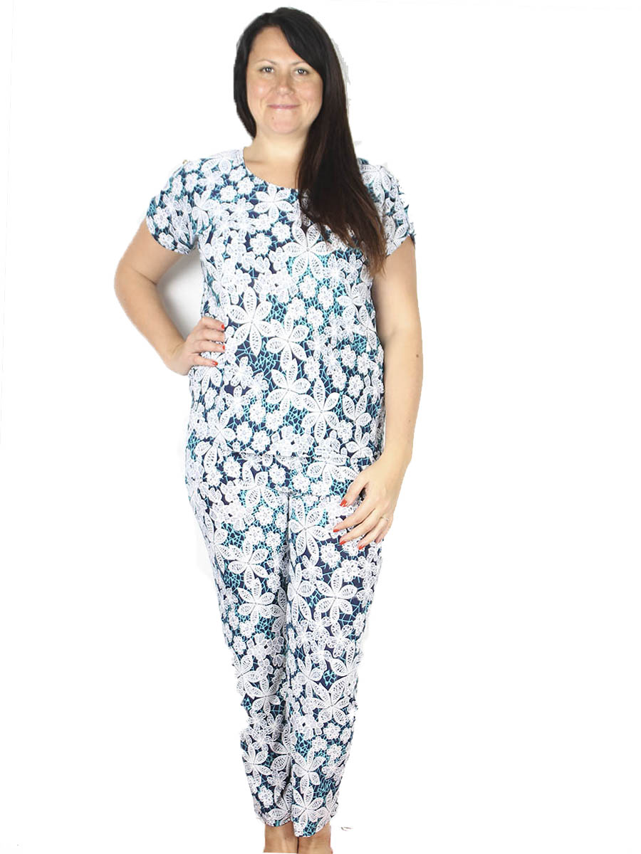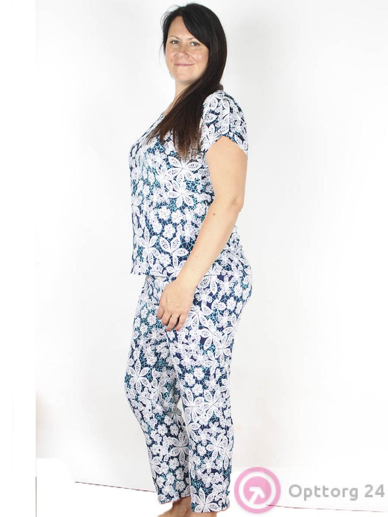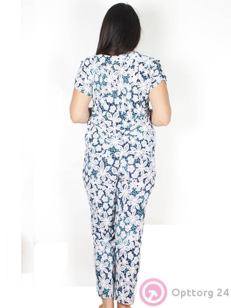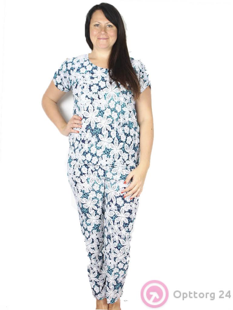 Женский костюм двойка футболка+штаны. модель синего цвета с бирюзовым отливом и белым принтом.