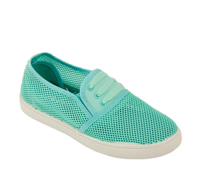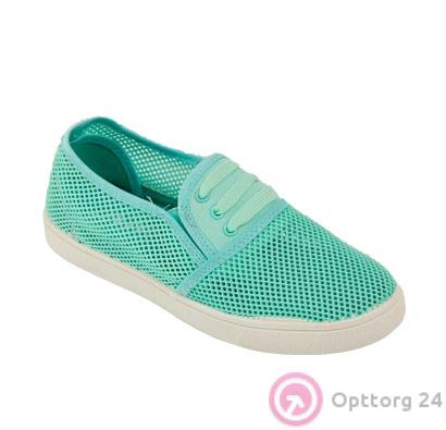 Легкие женские кеды бирюзового цвета. Верх изделия выполнен из сетчатого материала. Украшены кеды шнуровкой. Для регулировки объема предусмотрены эластичные резинки.