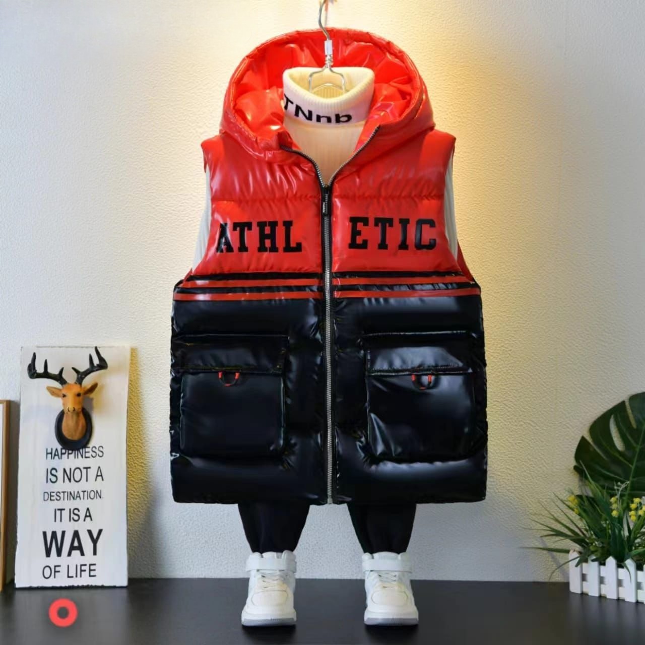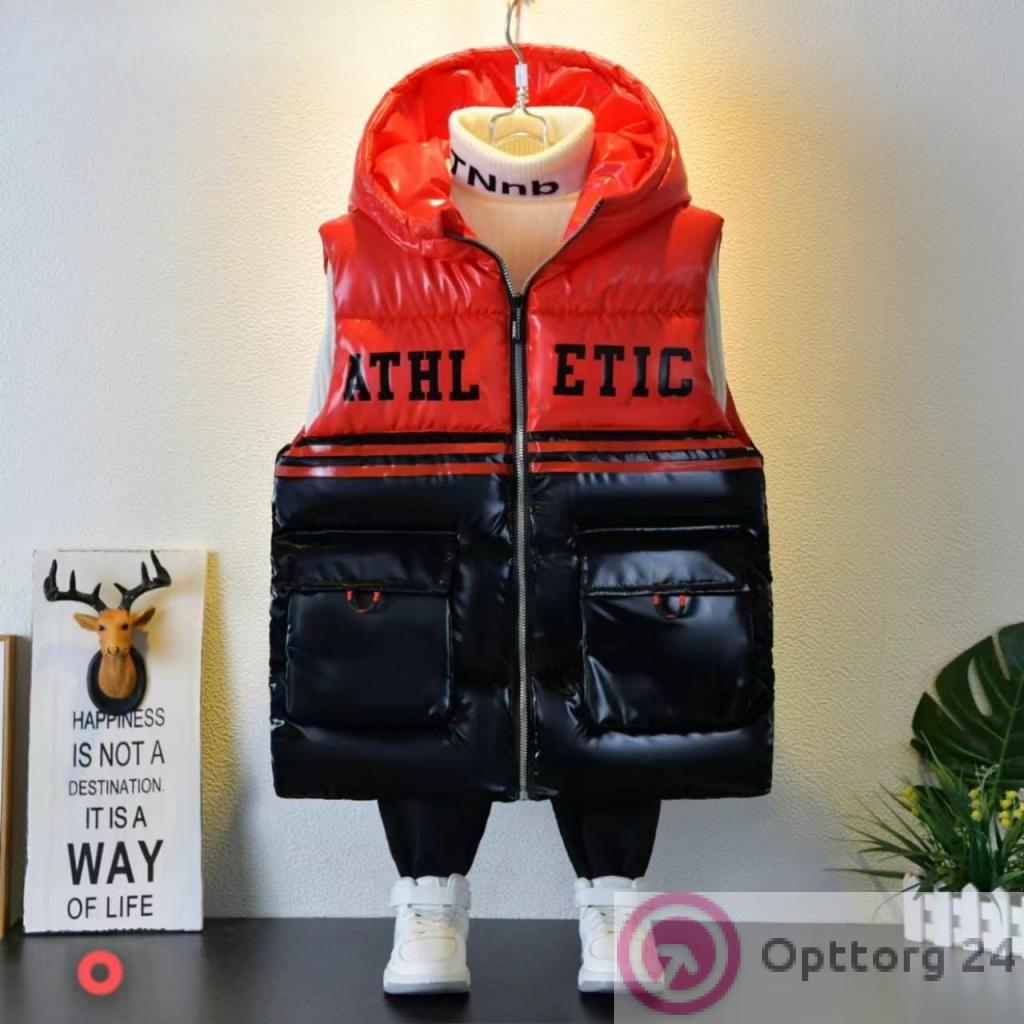 Жилет подростковый на синтепоне двухцветный. Застежка на молнии. Два накладных кармана по бокам. Есть капюшон, С принтом.